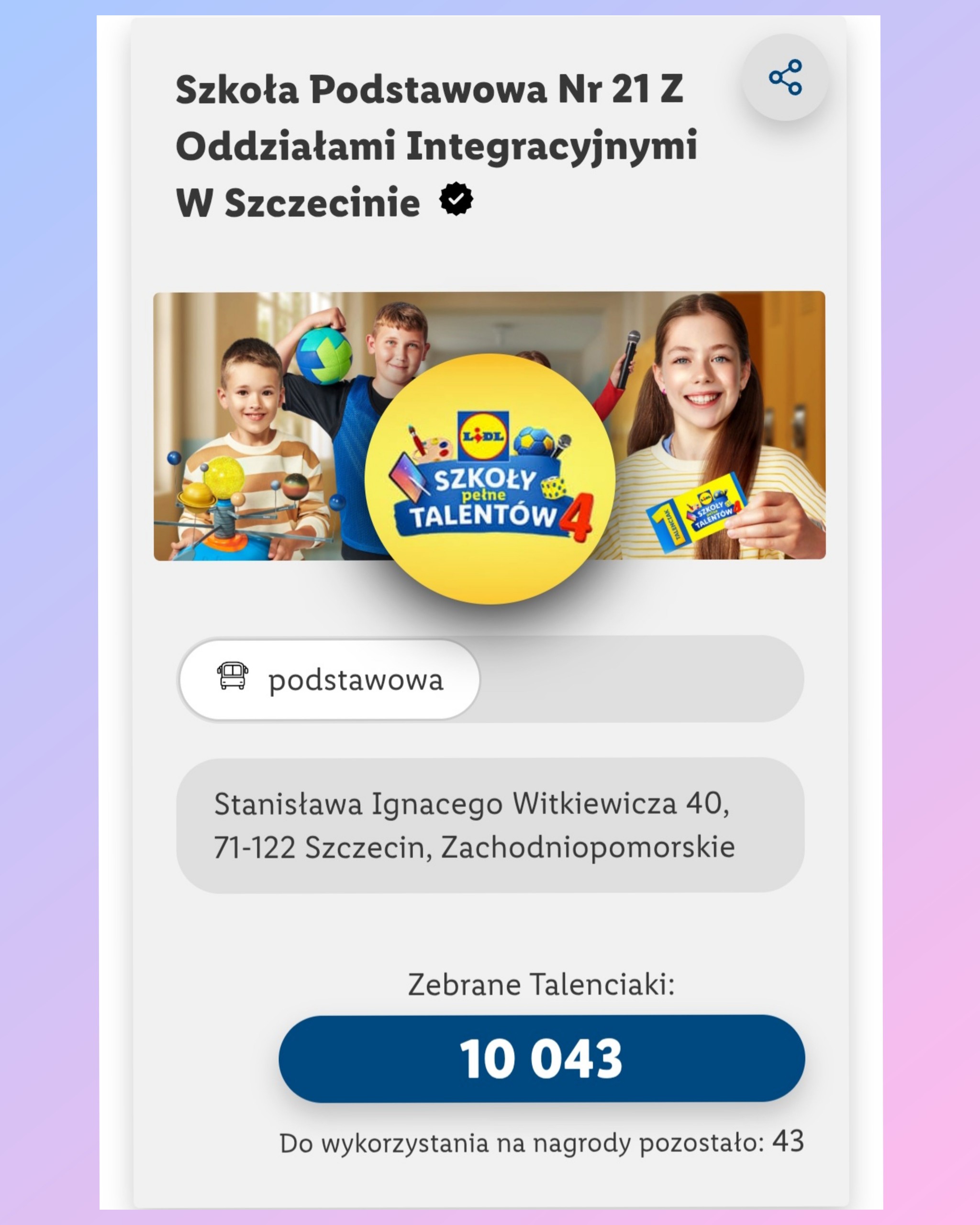 Z ogromną radością informujemy, że wszystkie zamówione przez szkołę nagrody zostały dostarczone. Dzięki niesamowitemu zaangażowaniu uczniów, rodziców, nauczycieli oraz pracowników szkoły, udało nam się zebrać rekordową ilość TALENCIAKÓW 10043 szt. To wspólny sukces całej naszej społeczności. Każdy wrzucony do pudełka lub zeskanowany kupon był głosem oddanym na rozwój naszych uczniow. Serdecznie dziękujemy!!!.